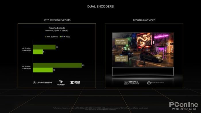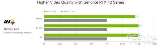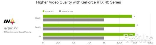 GeForce RTX 40系列显卡还有一个全新的升级,那就是双编码器NVENC。第八代的NVENC双编码器不仅支持H.264与H.265,还支持开放式视频编码格式 AV1。