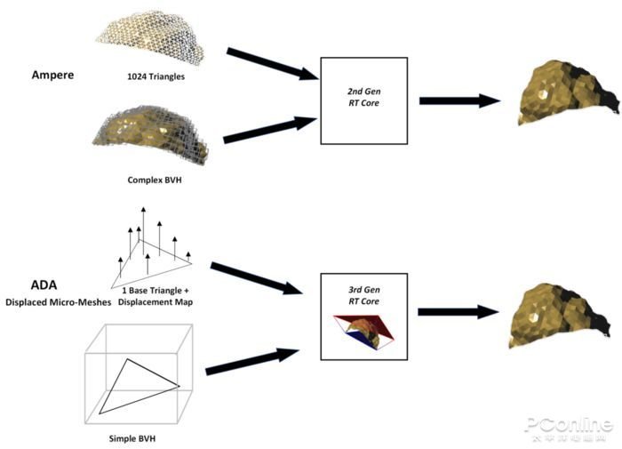 如果说Opacity Micromap Engine加速的是面处理,那么Displaced Micro-Meshes Engine就是几何曲面细节的加速器。如上图所示,在Ada Lovelace架构中,通过1个基底三角形+位移地图,就可以创建出一个高度详细的几何网格,所需要资源占用比二代RT Cores更低,效率也更高。