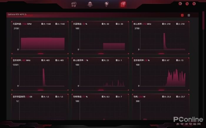 另外还能随时监控我们这张iGame GeForce RTX 4070 Ti水神显卡的运行频率、显存频率、功耗以及风扇转速,让用户对自己的硬件状况一清二楚。