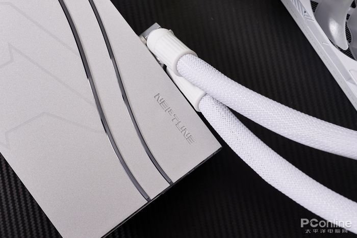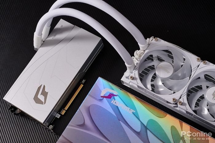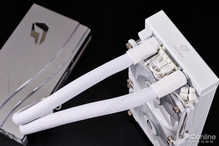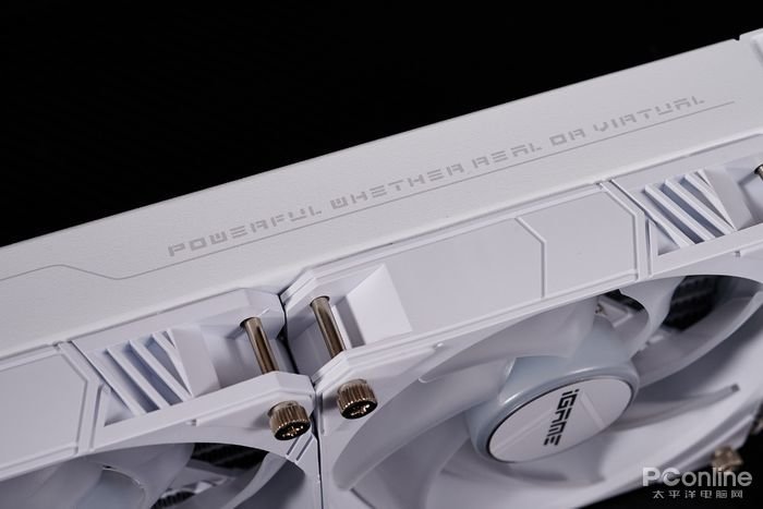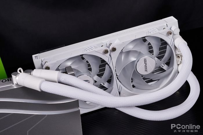 在冷排的侧面可以看到POWERFUL WHETHER REAL OR VIRTUAL(现实与虚拟均是最强的存在)的英文标识,而在冷排的两端还可以看到iGame的标志。