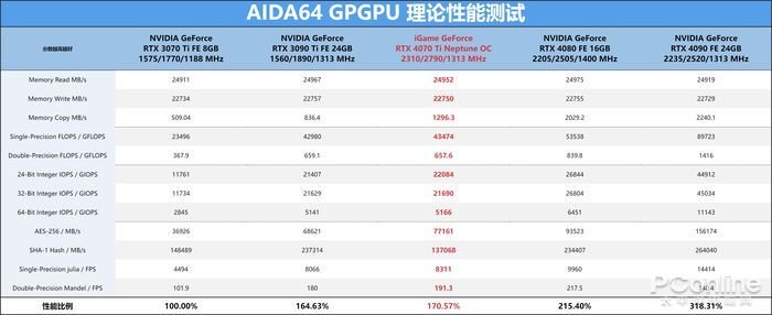 而来到算力方面,我们使用AIDA64 GPGPU进行测试,虽然iGame GeForce RTX 4070 Ti 水神的显存位宽不及前代显卡,但得益于升级到了GDDR6X,无论是速度还是算力都当仁不让,丝毫不逊色于RTX 3090 Ti。如果是对比前代RTX 3070 Ti,那性能提升更是颠覆性,整体性能差距足足有1.7倍。