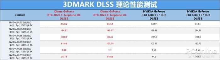 在最新版的3DMark测试软件中已经加入了DLSS 3相关的测试,有了DLSS 3后,iGame GeForce RTX 4070 Ti 水神如虎添翼,2K分辨率下,开关DLSS 3性能差距能够达到2.5倍以上,帧数稳定在165 FPS以上,可以说iGame GeForce RTX 4070 Ti 水神已经能够很好的满足2K@120Hz的游戏需求。