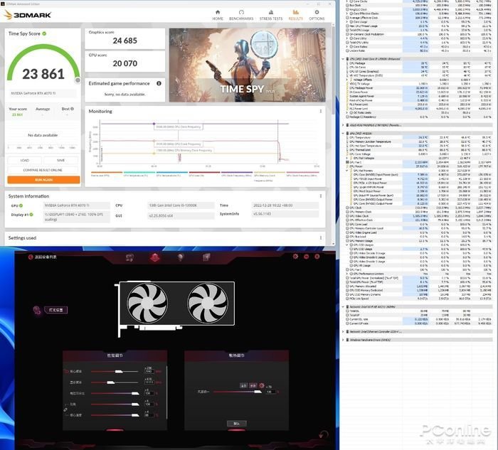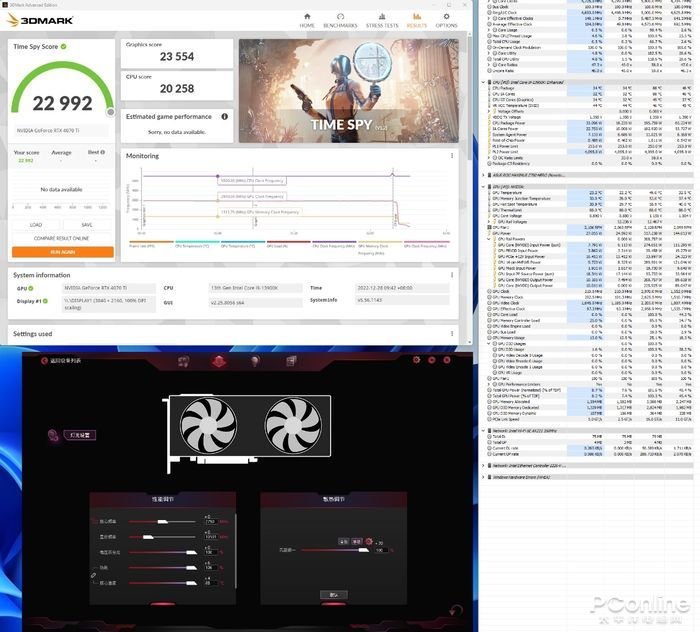 笔者没想到还没开始超频,这颗核心已经能够接近3000MHz,所以我们继续超频,在iGame Center 控制软件中将核心频率提高200MHz,显存频率则拉升610MHz,此时再次运行TimeSpy测试,此时iGame GeForce RTX 4070 Ti水神的得分相比默频状态高出1000分,整体性能提升约5.8%,并且核心频率已经跑至3135MHz,可见即使是RTX 4070 Ti,超频能力也不容小觑。