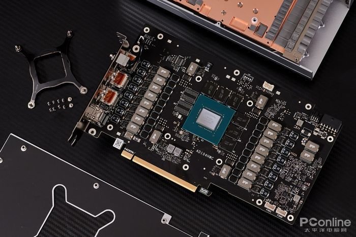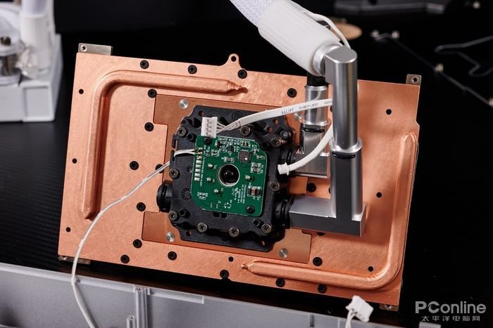 铜板模块也紧贴其旁边的水泵,而水泵的位置恰好处于AD104核心的背面,这样做的目的是能够最快的将核心热量传导出去。