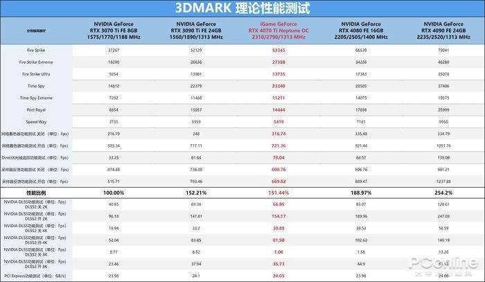 而在注重游戏的Time Spy和Fire Strike测试中,iGame GeForce RTX 4070 Ti 水神也有不俗的表现,两项成绩不仅仅领先RTX 3070 Ti约43%,比RTX 3090 Ti还要高上一些,这也让笔者对这张显卡的实际游戏表现充满期待。