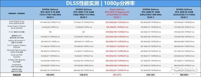 另外我们还实测了多款游戏跟程序,从实测结果来看,1080P分辨率下,iGame GeForce RTX 4070 Ti 水神在开启DLSS 3后性能有了质的飞跃,参测的多款游戏均跑出了200+ FPS的优秀成绩,这已经是用网游的标准在玩3A大作了。