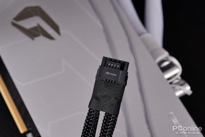 供电接口被安排在显卡顶部最靠右的位置,目的是装机时尽量不让电源线挡住这款显卡的颜值,接口用的是全新的12VHPWR供电接口,通过一根12VHPWR的电源线就可达到供电需求,单口600W的供电能力,用来应付RTX 4070 Ti可以说是大材小用了。