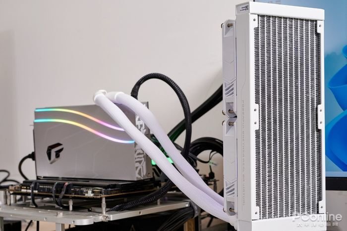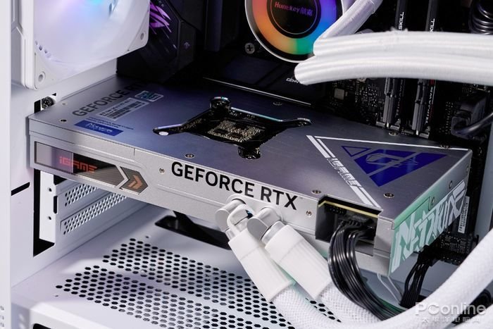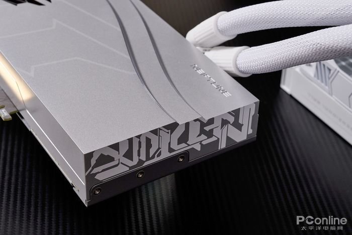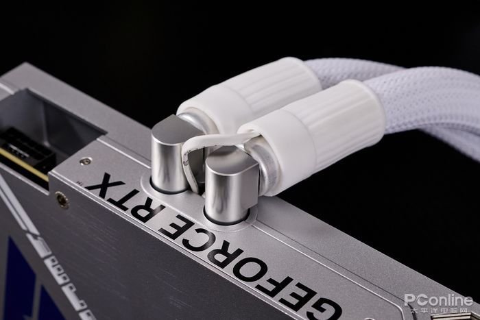 灯牌的附近是常见的“GEFORCE RTX”字样,另外还可以看到显卡本体通过两根水冷管与冷排连接。