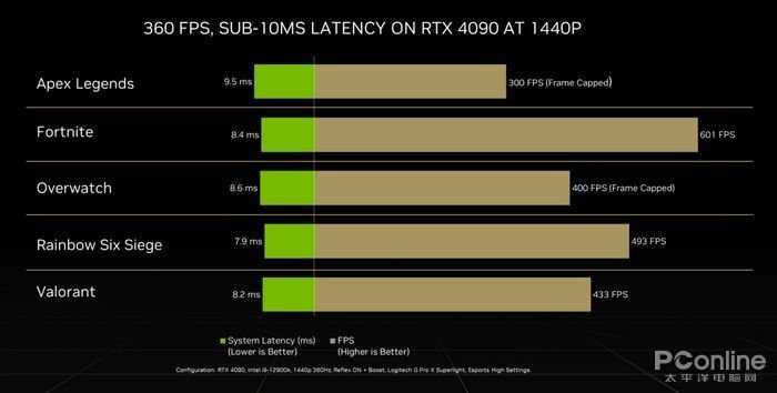 当GeForce RTX 40系列显卡和NVIDIA Reflex搭配上后,直接达到1440p分辨率360 FPS的体验,这着实是性能有点强劲了。