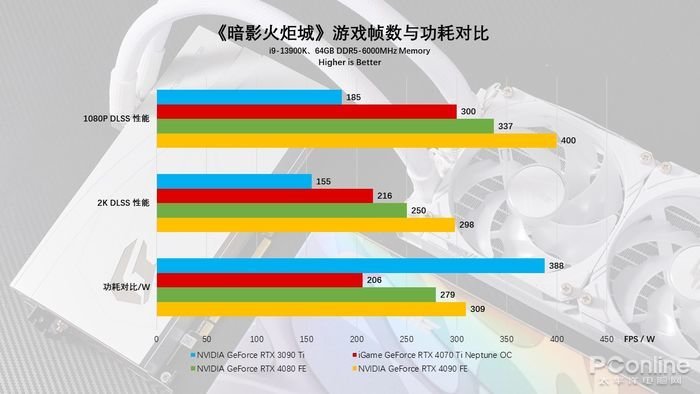 在实际的软件和游戏测试中也是这样,我们实测RTX 3090 Ti在游戏中基本跑的是430W的功耗,而iGame GeForce RTX 4070 Ti水神甚至不足300W,部分应用软件上甚至有更低的功耗表现。对硬件极高的《微软模拟飞行》中,iGame GeForce RTX 4070 Ti水神仅用186W的功耗就达到了RTX 3090 Ti 1.7倍以上的性能,要知道这比RTX 3090 Ti整整低了近250W,甚至还不到RTX 3090 Ti的一半功耗!