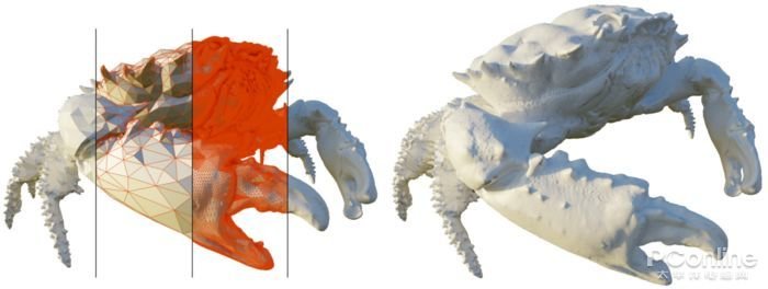 通过NVIDIA给出的创建14:1珊瑚蟹例子来说事,这里我们需要需要1.7万个微网格、160万个微三角形,在Ada Lovelace架构中BVH创建速度可加快7.6倍,存储空间缩小8.1倍。Displaced Micro-Meshes Engine起到了关键性的作用,其将一个几何物体根据不同细节分成密度不一的微网络处理,红色密度超高,细节处理越为复杂 。相应的低密度微网络区域则可以释放更多的资源与存储空间,这样Displaced Micro-Meshes Engine就可以帮助BVH加速过程,减少构建时间和存储成本。