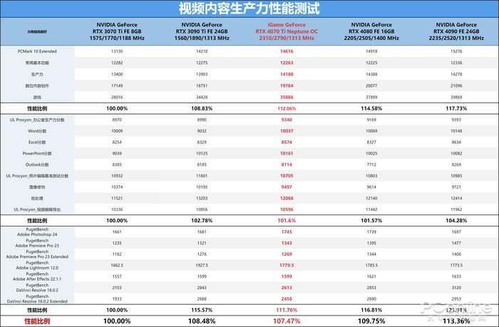 创作生产力也是检验一张高端显卡的必备科目之一,因此笔者这次选择了PugetBench、UL Procyon、PCMark 10等多款常见的测试软件,来测试iGame GeForce RTX 4070 Ti水神在日常办公、视频内容生产等方面的性能表现。