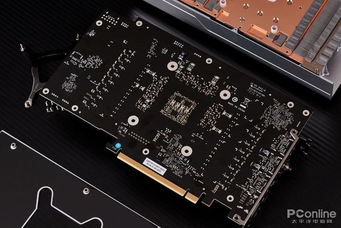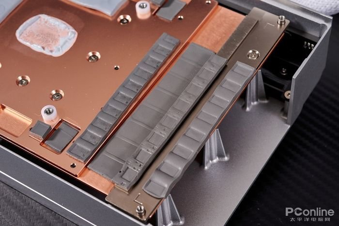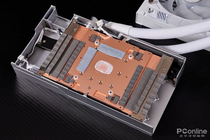 你以为铜板只是给PCB散热用的吗?其实在铜板模块的背面还隐藏着两根热管,既为显卡散热也为水泵降温,能够将热量导至金属装甲上,进一步冷却显卡。