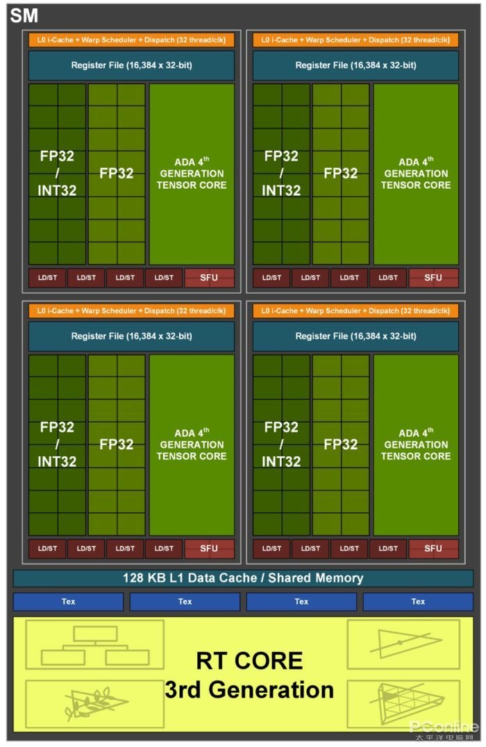 Ada Lovelace架构中最大的亮点之一:全新的SM流式多处理器,每个SM包含了128个CUDA核心、1个第三代的RT Cores,4个第四代 Tensor Cores(张量核心)、4个Texture Units(纹理单元)、256 KB Register File(寄存器堆),以及128 KB L1 数据缓存/共享内存子系统,于是这一个全新的SM单元有着超过上一代2倍之的性能表现。