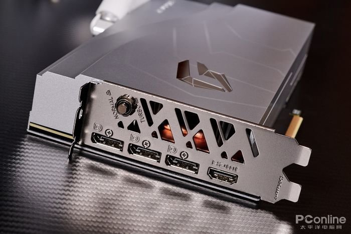 值得一提的是在接口的旁边还有一颗BIOS切换按钮,用来切换显卡的双BIOS设计,NORMAL模式下显卡会以更低的风扇转速运转,而切换至TURBO模式后,iGame GeForce RTX 4070 Ti 水神的Boost频率能够直接提升至2790MHz,带来更强劲的性能释放。
