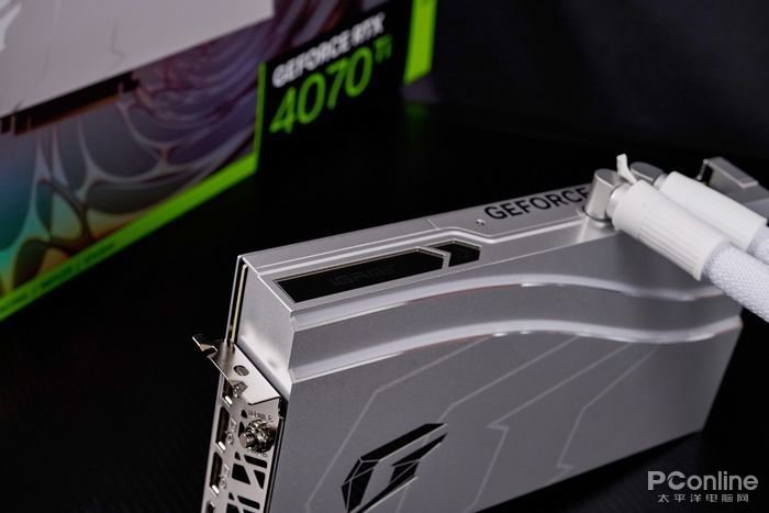 打开硕大的包装盒后,我们期待已久的iGame GeForce RTX 4070 Ti 水神终于揭开了它神秘的面纱。我们首先看到的是它的本体,采用银白色金属机身,细节做工相当精致,整体质感拉满。