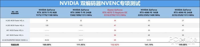 为了验证双NVENC编码器对视频创作的提升究竟有多大,我们使用NVIDIA提供的8K片源与工程文件分别测试AV1格式和H.265格式下的编码时间。实测同一段素材下,使用iGame GeForce RTX 4070 Ti水神进行AV1编码会比H.265编码快不少;即使同样使用H.265编码,有双编码器的加持下,iGame GeForce RTX 4070 Ti水神的效率也比RTX 3090 Ti快60%以上。