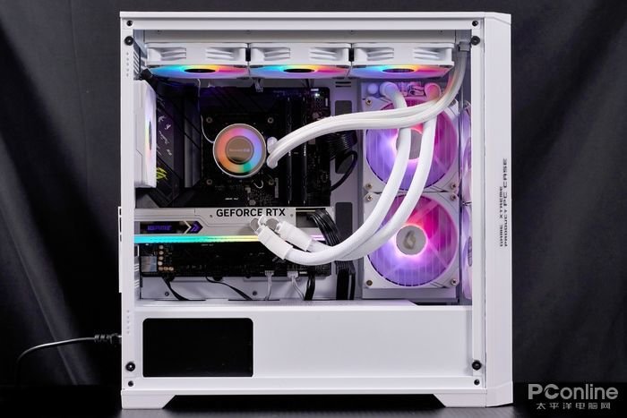 240冷排上的两把风扇同样支持ARGB调光,随着电源接通,两把风扇开始肆意舞动,灯效在这个半米见长的机箱内闪耀。
