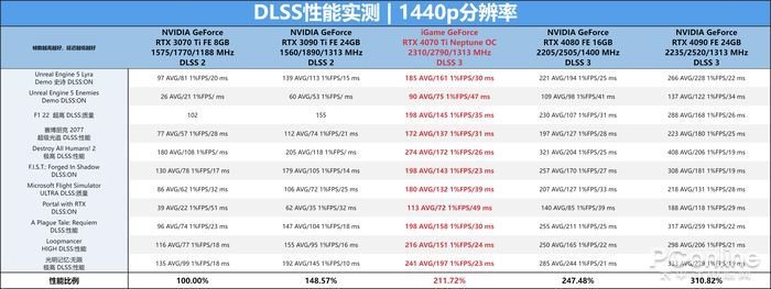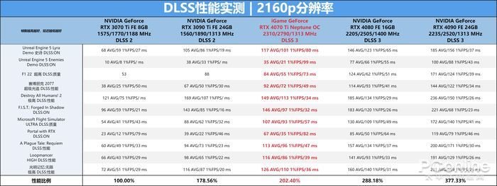 2K分辨率下,以iGame GeForce RTX 4070 Ti 水神的性能也是毫无压力,不少游戏开启DLSS 2时就已经领先RTX 3070 Ti有50-60帧,开启DLSS 3后性能还能更高,领先幅度来到了惊人的100帧以上,可以说这波DLSS 3功不可没。