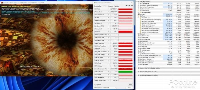 在上面的拆解中我们知道,iGame为这款GeForce RTX 4070 Ti水神配备了一个相当“唬人”的240冷排,散热配置堪称豪华。下面我们就利用Furmark软件,来对iGame GeForce RTX 4070 Ti水神进行功耗测试。