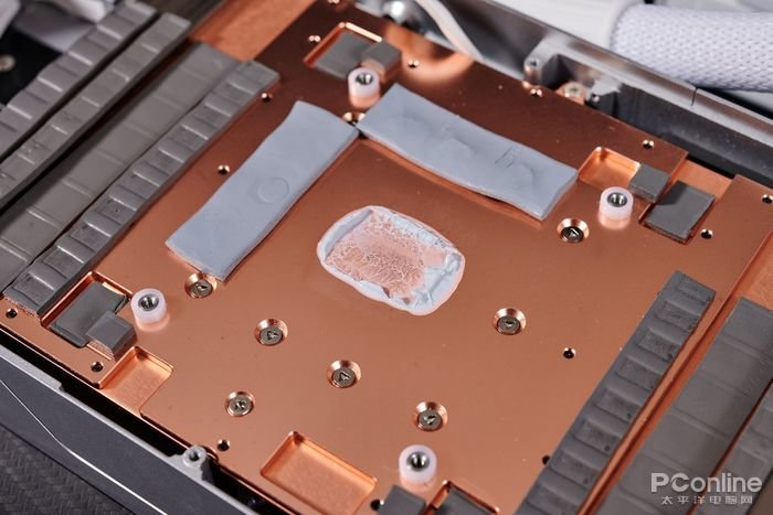 在铜板模块上可以看到厚厚的一层导热硅脂,有了这层硅脂,AD104核心与铜板间的空隙就填平了,热量也能全部转移至铜板上,有效降低温度,稳定释放性能。