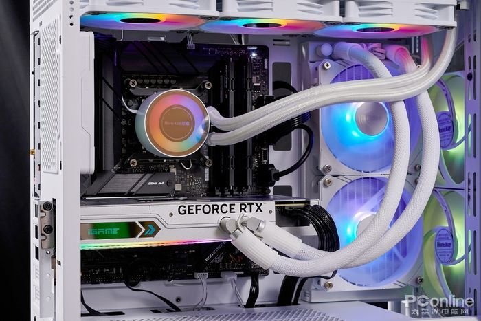 回流至冷排内的液体带走了铜板的热量后,再由2把12025风扇主动散热。不得不说这样的散热配置,别说是RTX 4070 Ti了,就算是次旗舰RTX 4080用也绰绰有余。