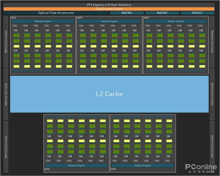 另外缓存方面Ada Lovelace架构也进行了大规格的提升,首先每个SM单元中单独配上了128 KB的缓存,其次核心的二级缓存进行进行了重新的设计,使得RTX 4070 Ti配备了48MB二级缓存,相比RTX 3070 Ti可以说是质的飞跃。