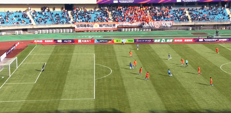 下半场比赛第55分钟,山东泰山队孙准浩主罚角球,刘洋禁区里射门反超比分。武汉三镇1比2山东泰山。