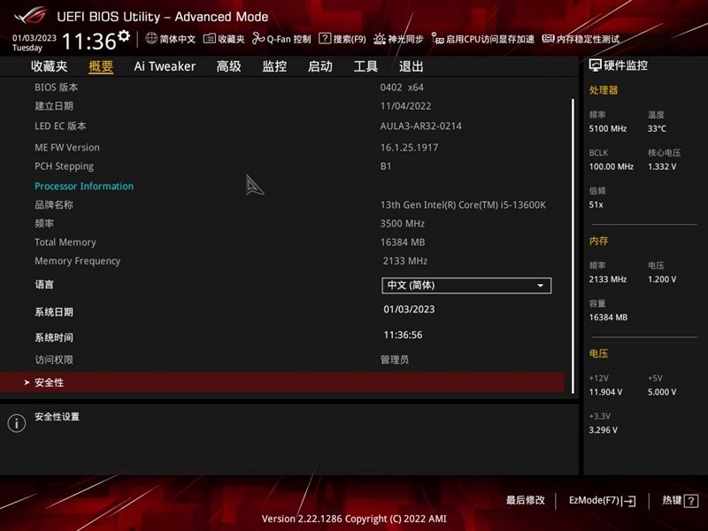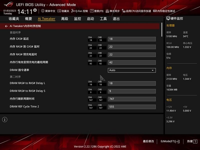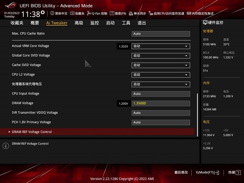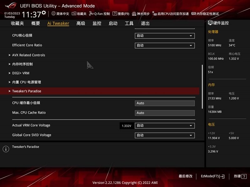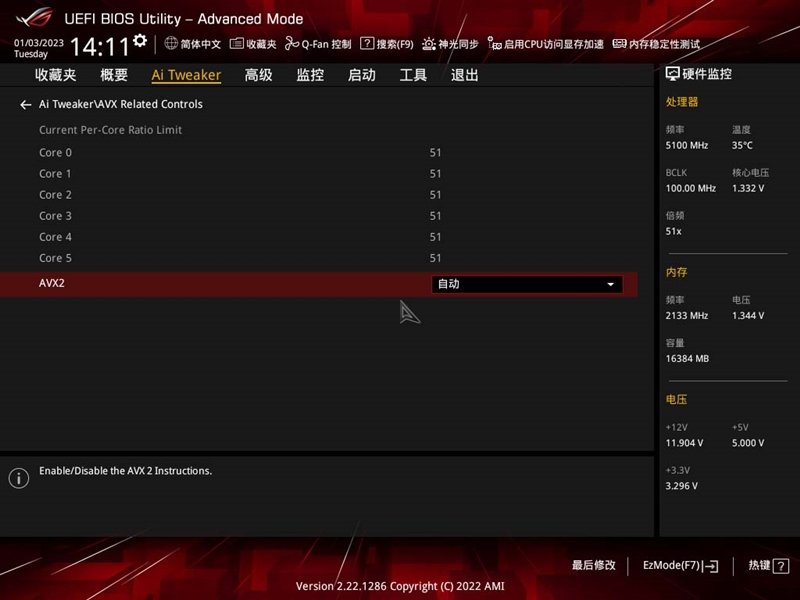 “Ai Tweaker”类目菜单,在这里可以对CPU进行电压、倍频、AVX进行管理,也支持内存电压、时序微调。