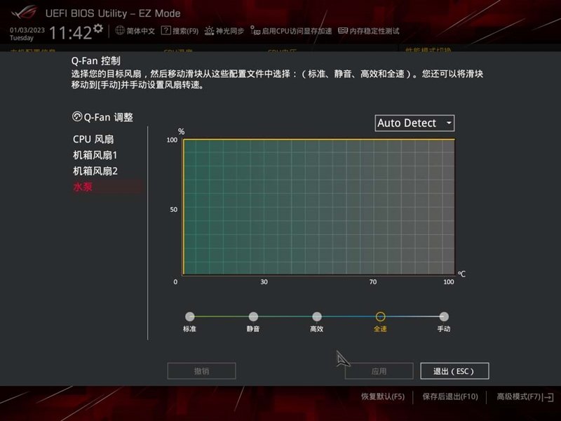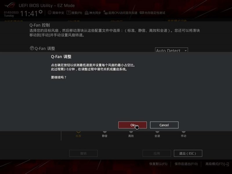 值得一提的是,上图中的“Q-FAN调整”也是可以点击的,AI会花费2-5分钟时间,会根据系统负载和温度表现,计算出合适的风扇转速方案。