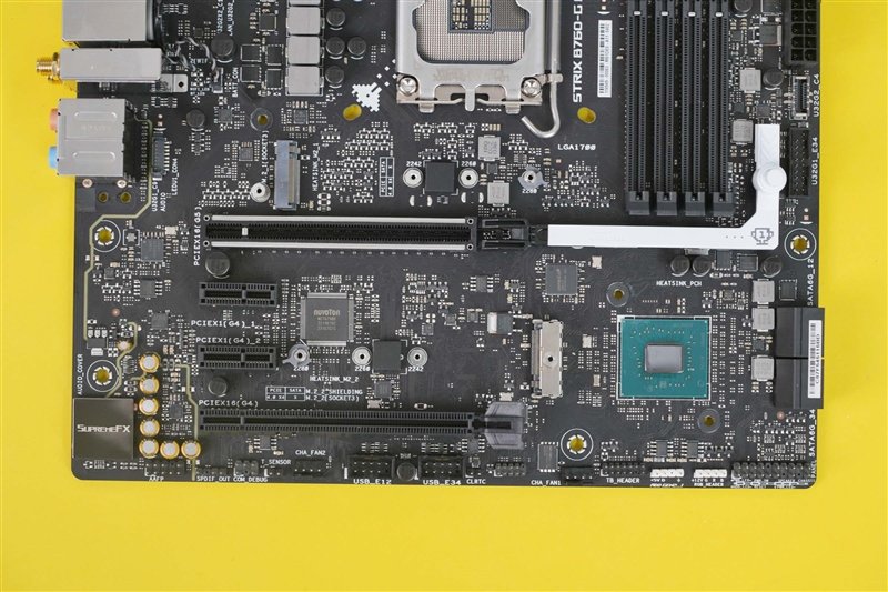ROG STRIX B760-G GAMING WIFI D4小吹雪主板下半部分芯片组和M.2插槽都配有散热盔甲。