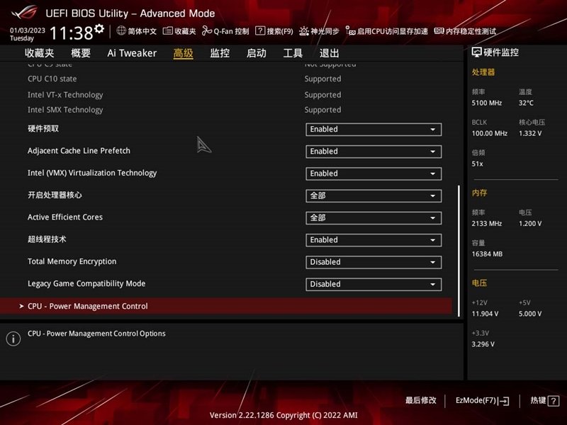 “高级”类目菜单,可以对CPU进行超线程技术、核心数量管理。
