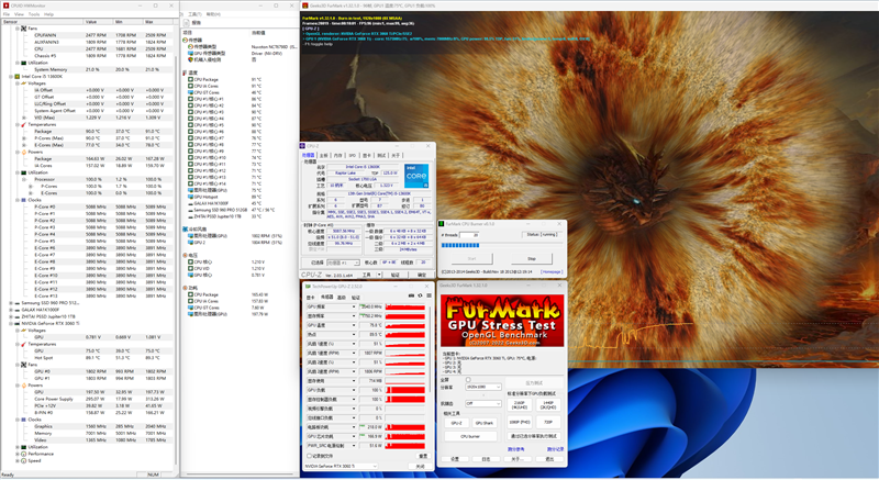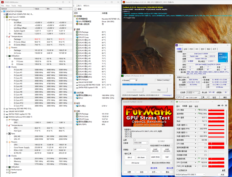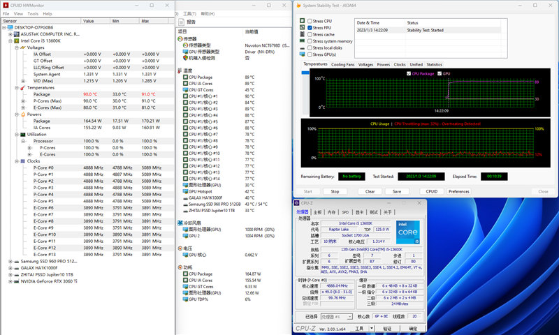 13600K的P核频率在5.1GHz,E核频率3.9GHz,当前温度在90摄氏度,电压1.229V,功耗在167W左右。