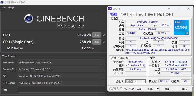 我们先在BIOS全默认(仅开启XMP)测试下酷睿i5-13600K的性能基准,在CINEBENCH R20中单线程取得758、多线程9174的成绩,这属于满血状态应有的成绩。