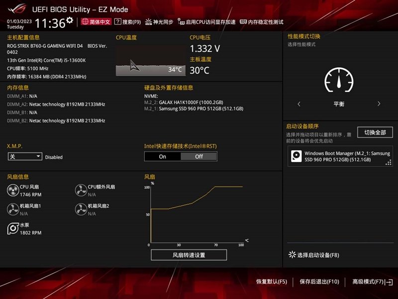 首次进入ROG STRIX B760-G GAMING WIFI D4小吹雪主板的BIOS,EZ MODE下可以看到CPU、主板、风扇灯硬件的信息,顶部还可开启CPU访问显存加速(对应的功能就是ReSize BAR)、神光同步、内存稳定测试工具。