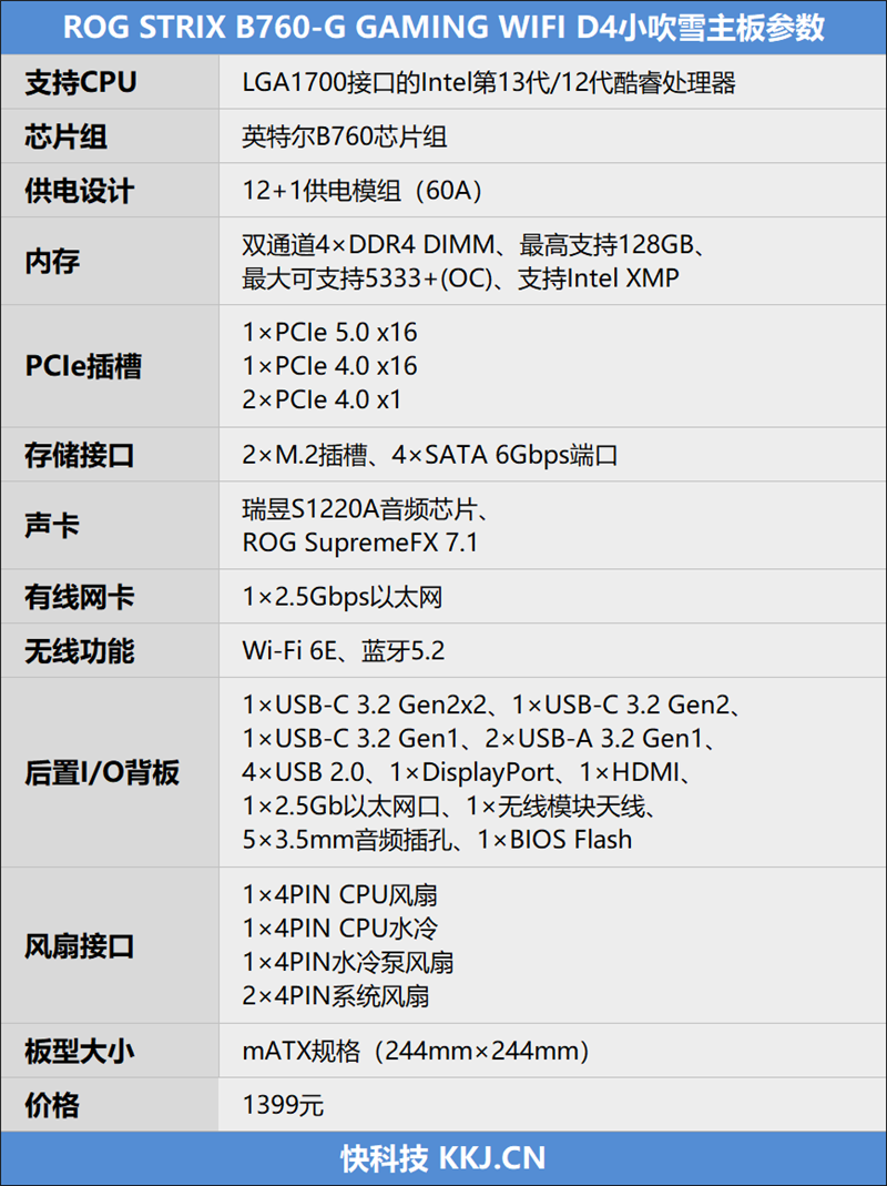如果你正在寻找一款外观特色、性能满血、玩法多样、扩展充足的mATX小主板,不需要处理器超频,那么这款ROG STRIX B760-G GAMING WIFI D4小吹雪主板,一定非常符合你的需求。