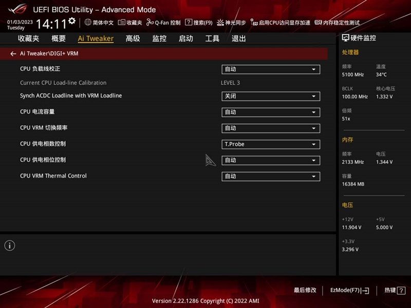 数字电压管理页面,在这里可以对CPU负载线校正、电流容量、供电控制进行管理。