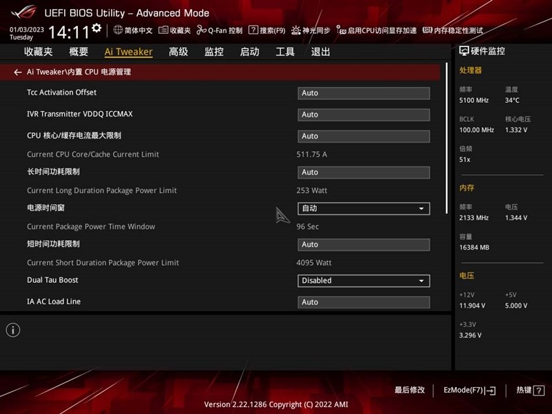 CPU电压管理页面,在这里可以看到短时功耗限制(PL1)默认解锁至4096W,基本不存在限制;长时功耗限制限制在253W。