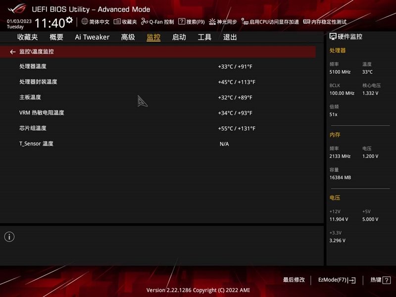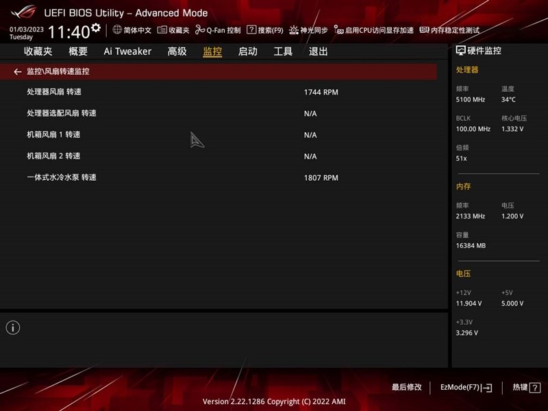 “监控”页面,在这里可以查看CPU、主板、VRM的温度,机箱、水冷的转速、还有电压信息等。