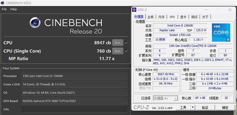 在CINEBENCH R20基准测试中,13600K取得了单线程760的成绩,相差不大。