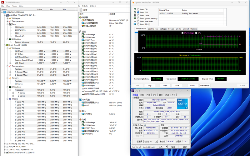 13600K的P核频率在5.1GHz,E核频率3.9GHz,当前温度在90摄氏度,电压1.233V,功耗在168W左右。