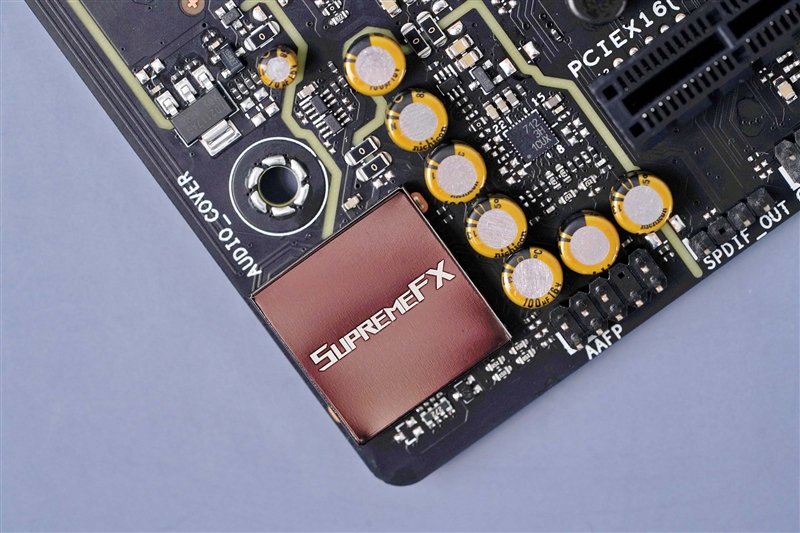音频区域,隐藏在SUPERMEFX电磁屏蔽盖子下的是瑞昱S1220A音频芯片,旁边的是音频电容、Savitech SV3H712 AMP放大器,支持阻抗侦测,能够提供纯净音频效果。