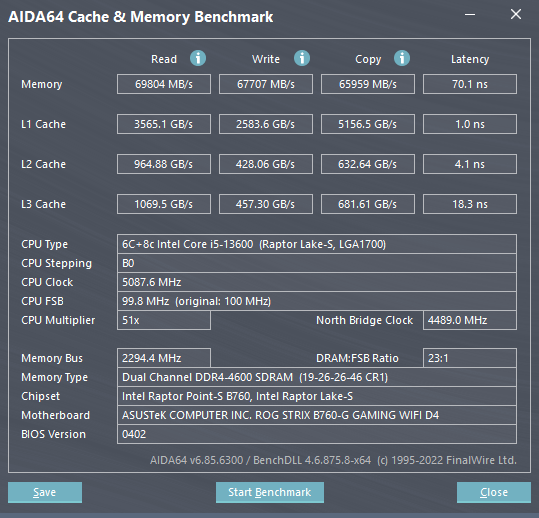 读取、写入、复制分别为69804MB/s、67707MB/s、65959MB/s,延迟为70.1ns。