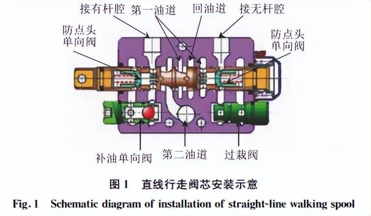 直线行走阀在挖掘机行走过程中通过阀芯的运 动对液压油实施再分配,从而完成动臂升降、斗杆收 放、铲斗转动、转台回转4组动作中的一个或其中任 意两个动作,图1所示为直线行走阀芯的安装示意 图。正常情况下,阀芯作为重要组件做轴向往复运 动,承受循环载荷,其失效形式多表现为疲劳断裂。 由于挖掘机工作环境较为恶劣,在分析阀芯疲劳断 裂的原因时,应考虑机械振动引入的横向载荷作用。 相关文献[1-2]介绍了振动疲劳在疲劳分析中的应用, 近年来,国内学者们也从不同角度开展了大量与疲劳相关的研究[3-6],并取得了丰硕的成果。