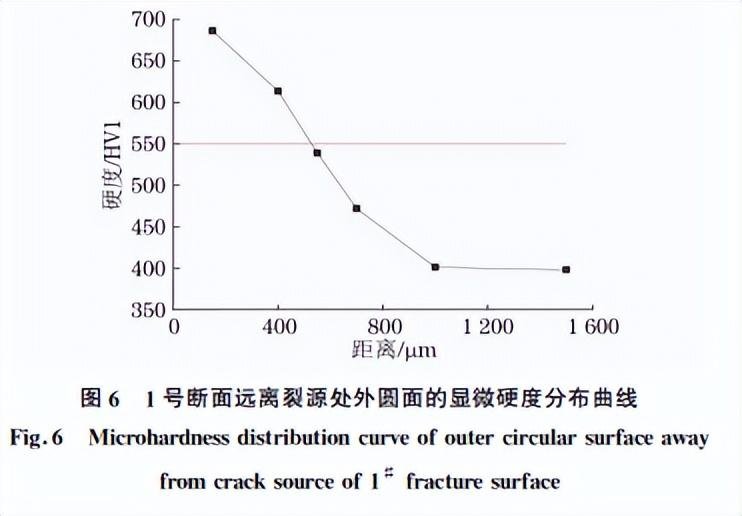 对1号断面裂纹源处进行显微硬度试验,对远 离裂纹源的外圆面进行显微硬度和显微硬度梯度试 验。结果表明:裂纹源处显微硬度约810HV1,明 显高于 远 离 裂 纹 源 处 的 外 圆 面 的 硬 度 (约 为 700HV1)。图 6 显 示 有 效 硬 化 层 深 度 约 为 0.5mm,满足技术要求(0.3~0.6mm)。