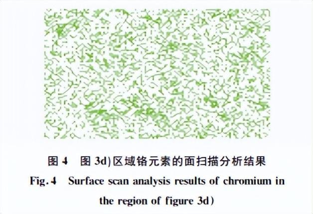对1号断面进行微观形貌观察和能谱分析,如 图3所示。1号断面由外缘灰白色渗碳区和中心椭 圆形深灰色基体区组成,裂纹源处(图3a)圆圈处)为尖角过渡,尖角效应明显。进一步放大观察发现, 裂纹源处为典型的冰糖状沿晶断口,其外表面可见 环向磨损痕迹,用手触摸有明显毛刺感,见图3b)。 将裂纹源进一步放大观察发现,油孔边缘分布着多 条沿晶扩展的显微裂纹,晶界上存在大量条块状 Cr-Fe碳 化 物,扩 展 区 疲 劳 条 纹 清 晰 可 见,如 图3c)~d),面扫描分析结果如图4所示。