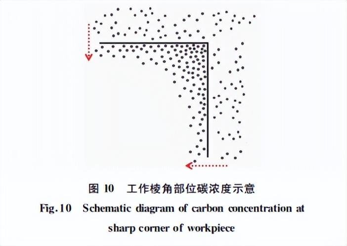 在设计阶段,设计者需要根据工件结构和服役工况对部件或系统进行建模和仿真计算,根据计算 结果完善工件结构。首先,阀芯在服役过程中所受 横向载荷极小,可以忽略不计,按阀芯仅受18kN 的轴向载荷计算,结果表明:最大应力区域与断裂位 置完全吻合,且边缘是否倒角处理对最大应力的分 布并无明显影响。经检验证明,6处断面的疲劳源 均位于油孔边缘,其原因包括以下三个方面:(1)表 面应力状态,该阀芯油孔边缘未进行倒角处理,呈锐 角过渡,棱角效应显著;(2)表面完整性[7],油孔边缘 的打磨损伤使其表面粗糙度增加,在相同的应力水 平作用下,零件的疲劳寿命随着表面粗糙度的增加 而降低,对于高强度、低韧性的材料,粗糙度的影响 更明显,另外,打磨痕迹沿环向分布,当受到与其垂 直的轴向载荷作用时,更易萌生疲劳裂纹;(3)表面 组织结构,渗碳工艺不良造成油孔边缘形成断续网 状分布的碳化物,组织均匀性差、硬度高、脆性大,降 低了边缘处的抗疲劳强度[8-9]。棱角处存在图10所 示的“棱角效应”,李宇、潘健生等[10-11]对常见形状 工件在渗碳过程中的“棱角效应”进行了计算机模拟 和定量表征,结果表明:工件棱角部位的角度是决定 “棱角效应”的内在因素,棱角影响距离随工件棱角 部位角度的增加而减小。边缘倒角,一方面可改善 工件表面应力状态,另一方面可减轻或消除棱角效 应造成的渗碳不良现象。