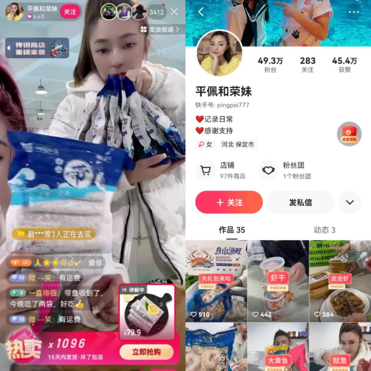 在频繁试水后,平荣于姐姐平佩的快手账号“平佩和荣妹”正式直播。依然是以不露脸的形式,平荣靠近镜头,只露出几缕头发,偶尔会露出半张脸,为粉丝介绍产品进行带货。直播评论区许多平荣粉丝发声怀念平荣,在为其添加人气。