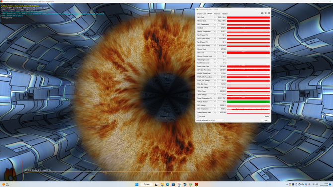 通过GPU-Z的识别我们可以看到,全新的七彩虹iGame GeForce RTX 4070 Ti Advanced OC采用了AD104核心,核心面积为295mm²,使用12GB的GDDR6X显存,显存位宽是192bit,CUDA数量为7680,相对于RTX 4090的16384少了一半还多,相对RTX 4080 16G少了2048个CUDA单元。