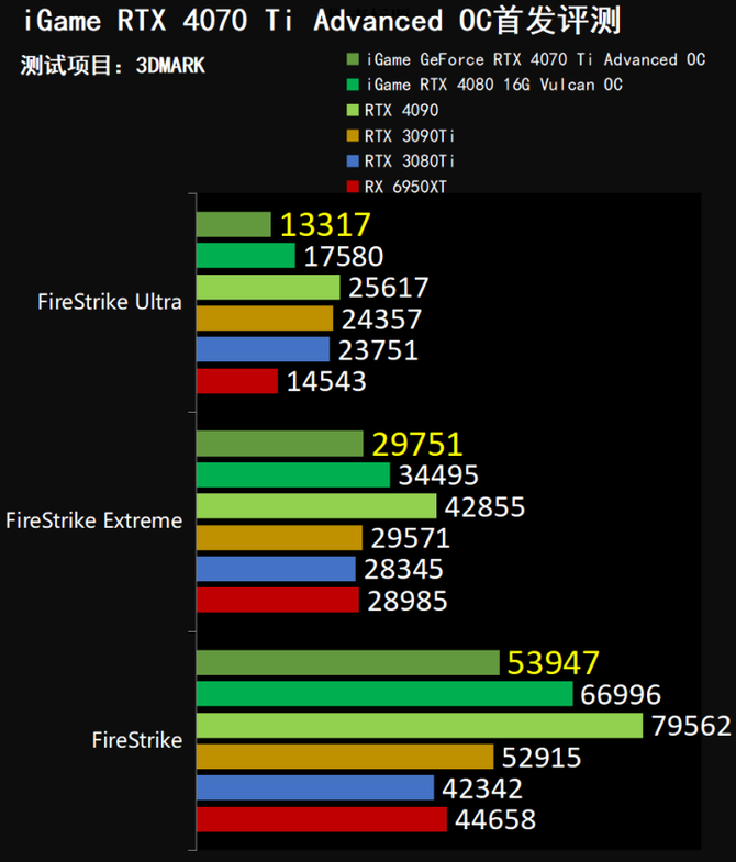 3DMARK DX11性能测试环节中我们可以看到,全新的七彩虹iGame GeForce RTX 4070 Ti Advanced OC在FireStrike Extreme项目上领先RTX 3090 Ti,在FireStrike项目同样领先RTX 3090 Ti,并且大幅领先RTX 3080 Ti。